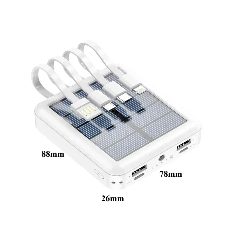 - Features: Solar Charging, Flashlight, Built-in Cables, LED Lamp, Two-way Quick Charge